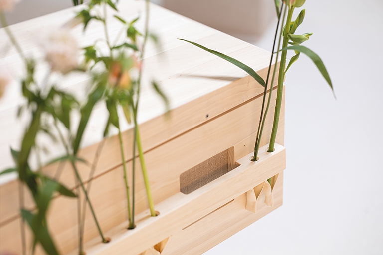 De Fiori is een massief populierenhout kist met een eenvoudig en rustig design, waarbij je zelf een persoonlijke touch kunt geven. De lange grepen aan de zijkant hebben kleine openingen waar je bijvoorbeeld bloemen in kunt steken. Dankzij de lussen aan de onderkant van de grepen blijven de stelen netjes op dezelfde hoogte zitten. Om de kist makkelijk te dragen zijn er uitsparingen in de zijkant gemaakt, die zijn bekleed met linnen voor extra comfort en stevigheid.