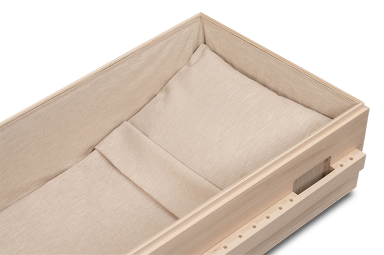 De binnenbekleding van deze kist is gemaakt van linnen. Linnen is een natuurproduct van vlas en is biologisch afbreekbaar.